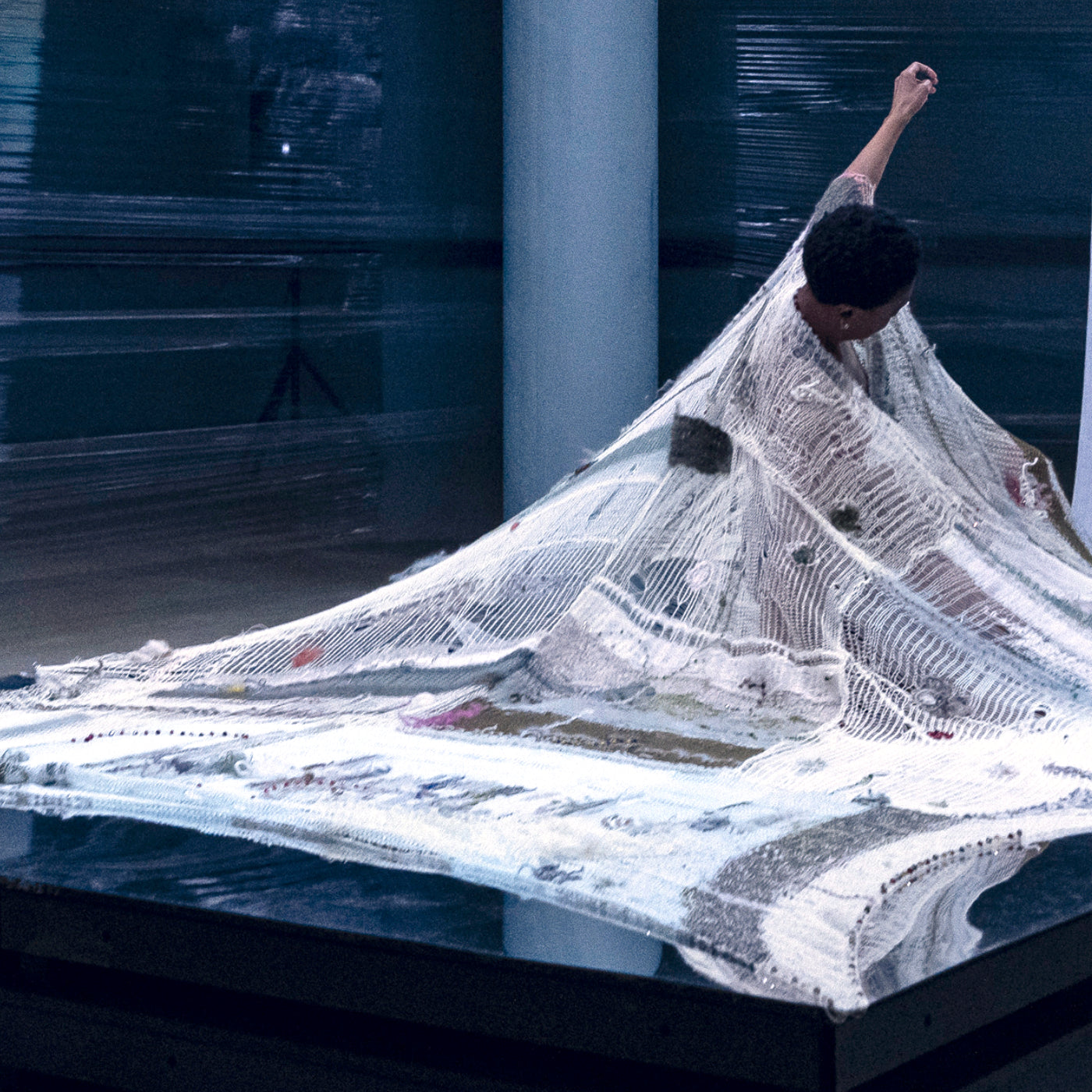 In 2023 we were commissioned by dancer / performance artist Nelisiwe Xaba to create a massive piece of knitting for use in her piece, vRot. A base of linen yarn was embellished with knitting in wool, mohair and cotton, and then hand stitched and beaded.